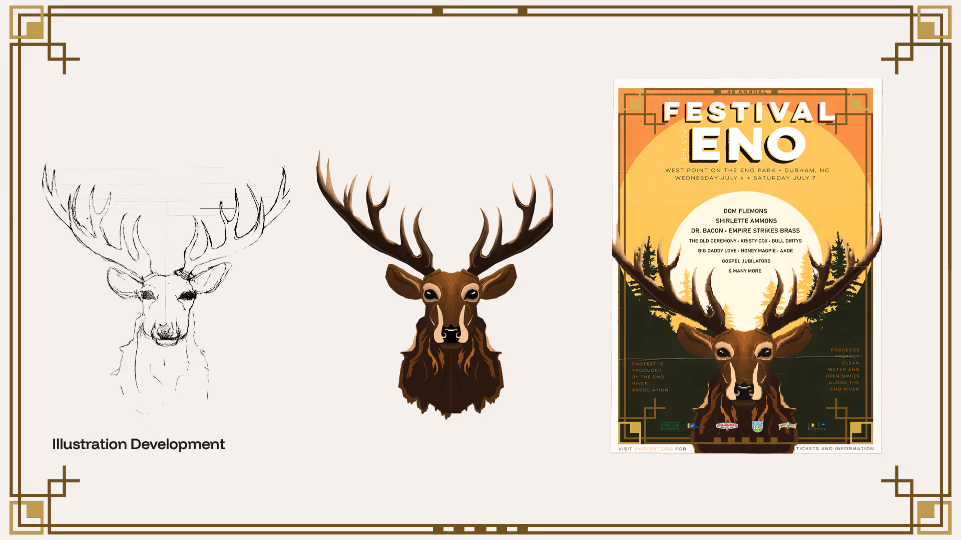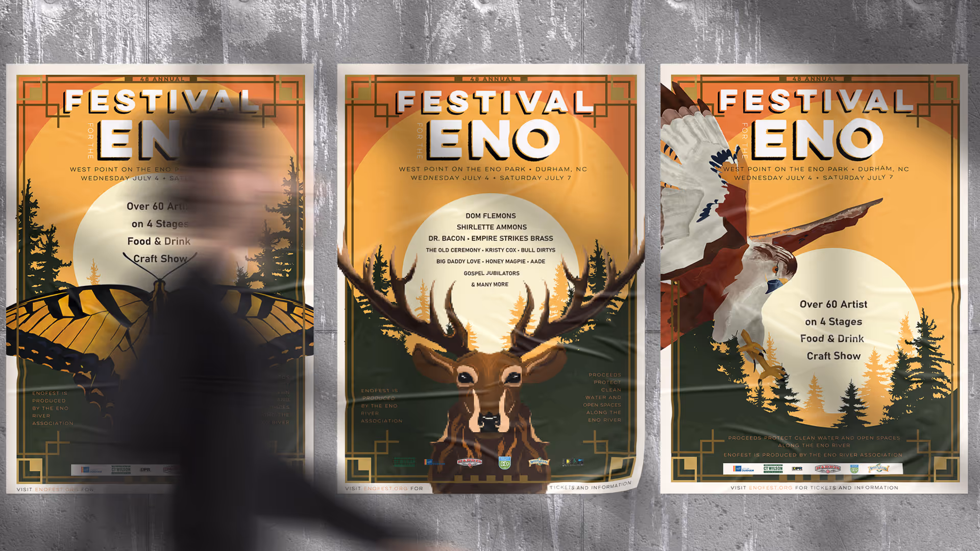 A logo system, color palette, and poster series that blend organic form, local wildlife, and vibrant color to convey the festival’s creative energy and its enduring connection to the Eno River.